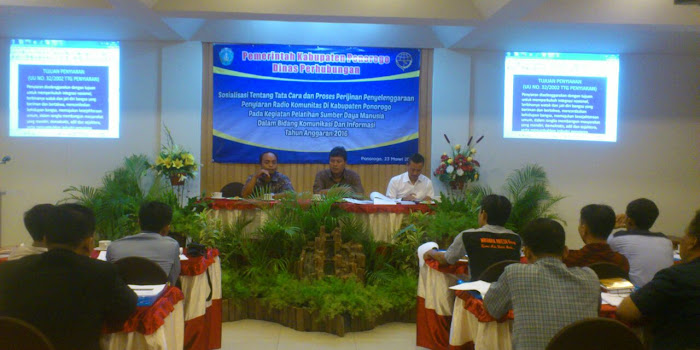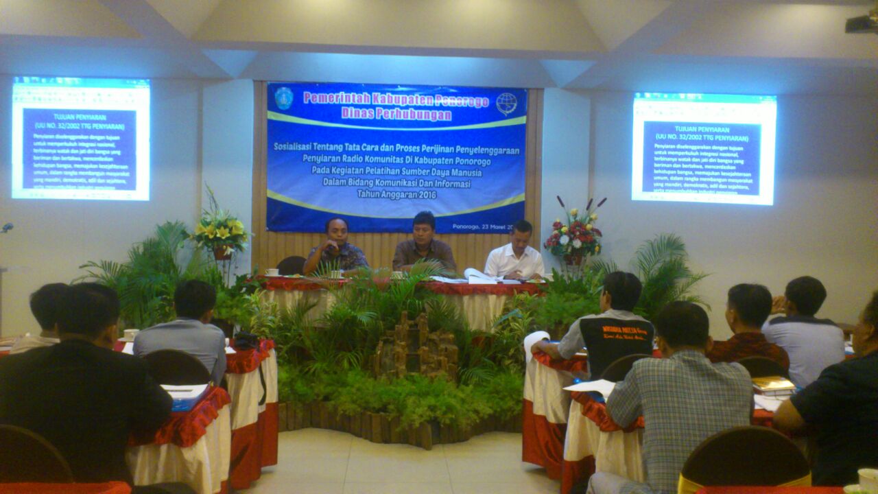 Sosialisasi Tentang tatacara dan proses Perijinan penyelengaraan Penyiaran Radio Komunitas di Kabupaten Ponorogo pada kegiatan pelatihan sumber daya manusia dalam bidang Komunikasi dan informasi tahun anggaran 2016 yang diadakan oleh Dinas Perhubungan Kabupaten ponorogo.